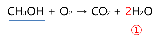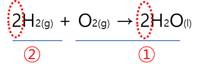 ① 반응물의 산소 개수 2개와 생성물 산소 원자 개수를 맞추기 위해 물분자 앞에 2를 붙입니다.