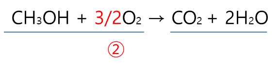 ② 생성물의 산소 원자가 총 4개, 반응물의 산소 원자 개수를 맞추기 위해 산소분자 계수를 3/2를 붙여서 반응물 산소원자 총개수를 맞춥니다. 이때 계수를 분수를 붙여도 됩니다.
