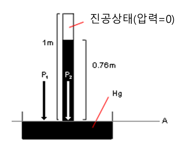 수은이 가득담긴 용기 안에 유리관을 담가서공기가 들어 있지 않은 상태로 유리관을 세웠더니 수은이 어느정도 내려가서 멈추었다.