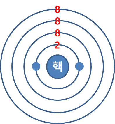 *옥텟이란? 숫자 8을 의미한다. 1. 제일 안쪽 궤도는 너무 작아서 전자가 2개 이상 들어가지 못한다. 나머지 궤도에는 전자가 8개 이상 들어가지 못한다. 2. 전자는 안쪽 궤도에서부터 차례로 채워 나간다. ![]()