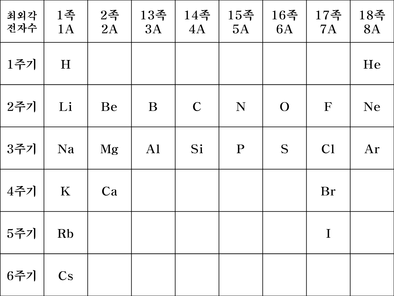 * 족 : 최외각 전자 수 혹은 원자가(원자의 가장자리) 전자 수라 고도한다.