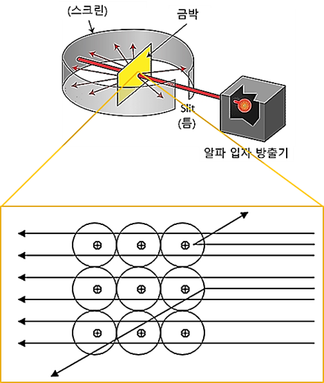 알파 입자가 통과하는 금박을 확대해보면 위의 그림과 같이 설명할 수 있다.