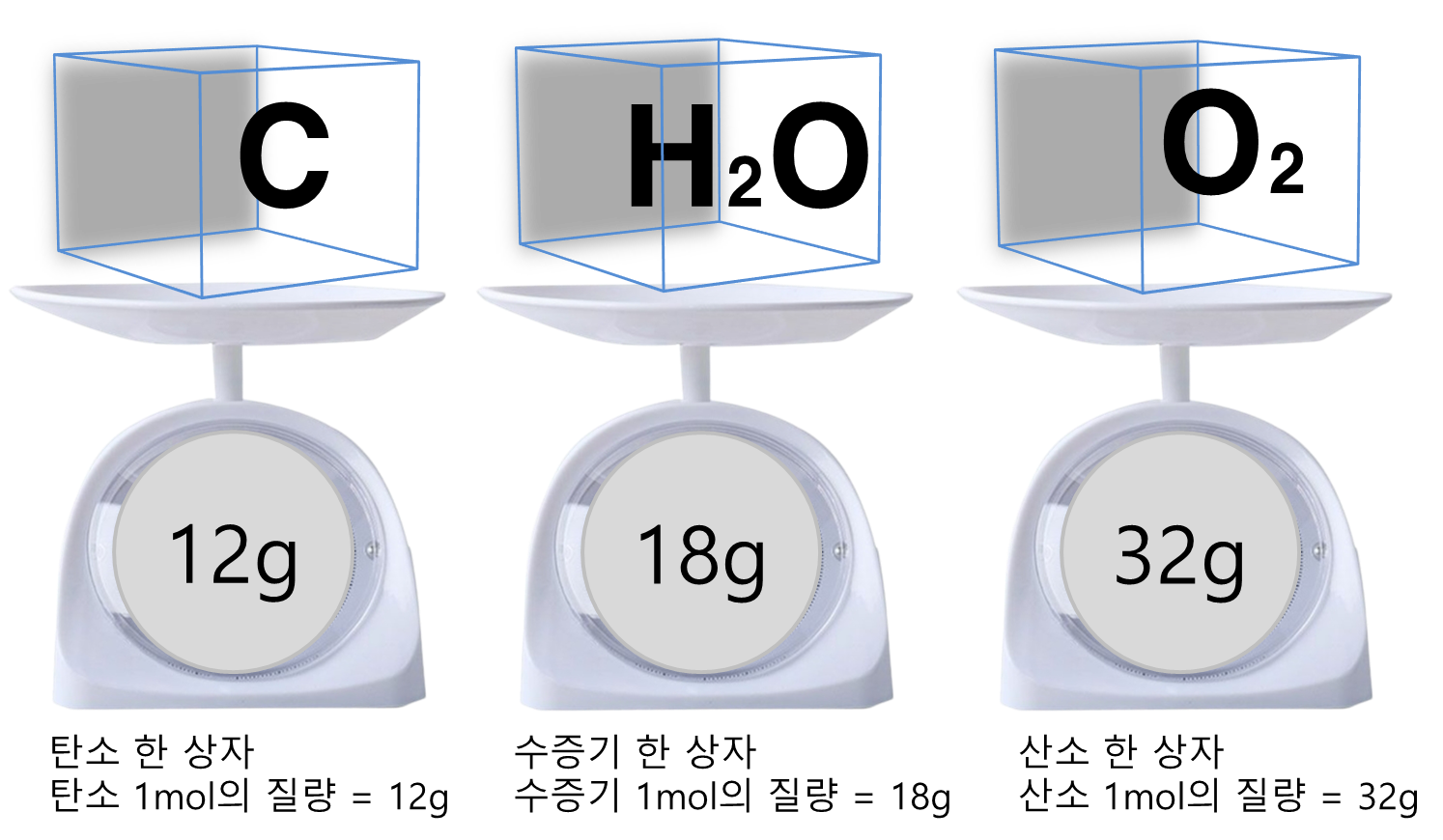 이 상자에 어떤 원자가 들어 있어도 개수는 같지만 질량이 다릅니다. 그래서 mol을 사용할 때는 성분 표시를 반드시 해야 합니다.