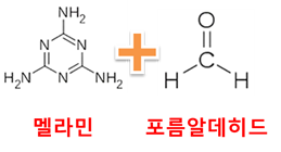 멜라민과 포름알데히드를 결합시켜 멜라민 수지를 만든다.