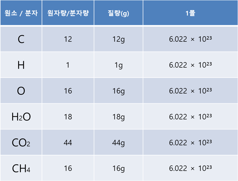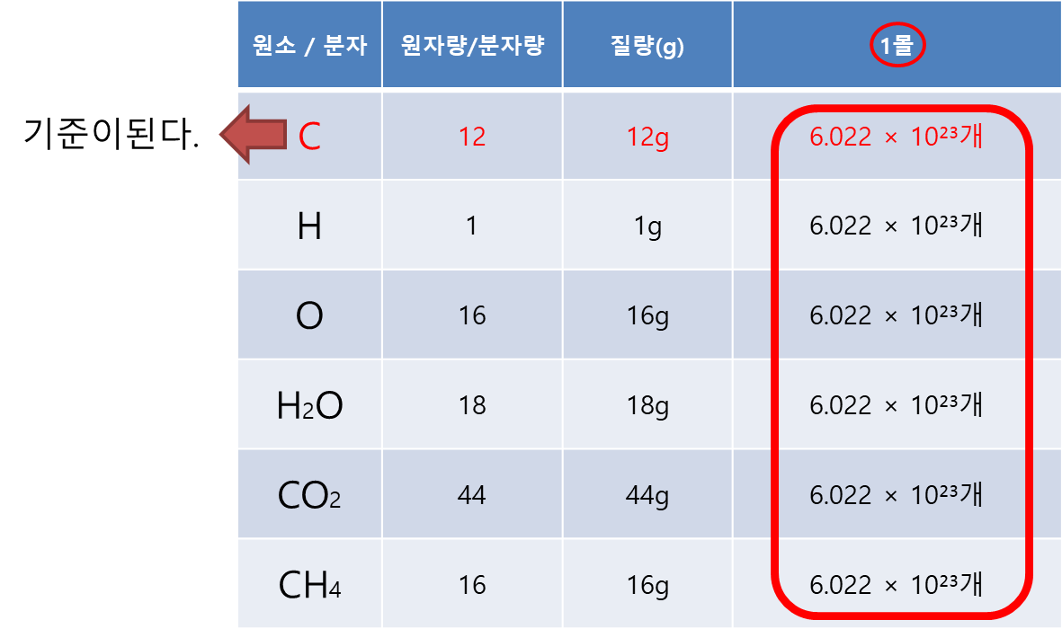 | 1 mol의 정의는? 1 mol = 원자번호 12번 탄소의 12g 중에 포함된 원자의 수 = 6.022 × 10²³개 |