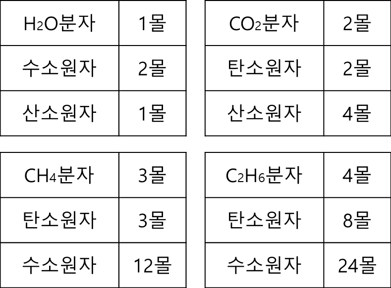 위에 탄소를 기준으로 각 원소와 분자의 원자량의 비례가 성립하려면 개수가 모두 동일해야 합니다.