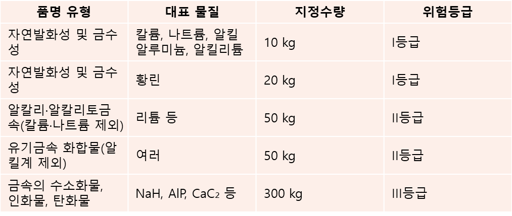 - 금수성: 나트륨, 칼륨, 칼슘, 금속수소화물, 금속탄화물, 금속인화물