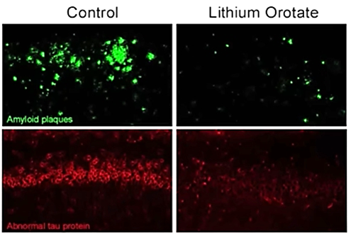 네. 쥐에게 리튬이 거의 없는 식이를 제공하자 기억력이 감소하고 치매 증상이 나타났다. 하지만 이들에게 리튬 오로테이트를 아주 적은 양 투여하자, 놀랍게도 아밀로이드와 타우 단백질이 줄고 기억력이 젊은 개체 수준으로 회복됐다.